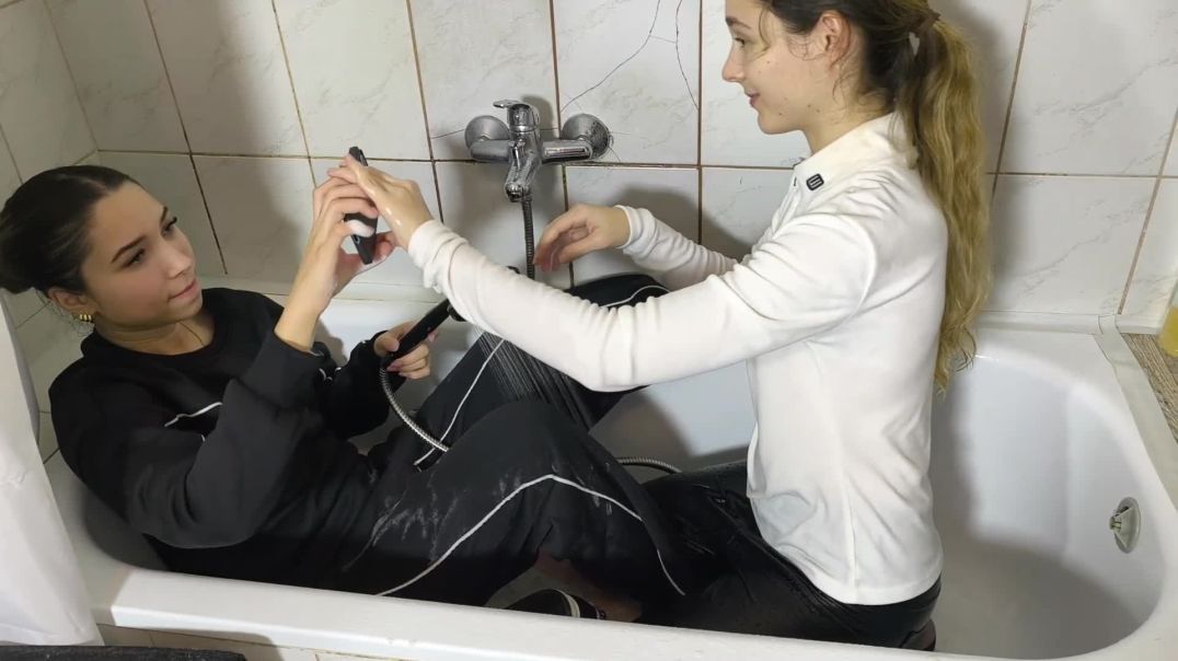Ellie and Violet continue their wetlook journey together as Violet, already thoroughly soaked, is joined by Ellie in the bathtub and the two enjoy a playful, relaxed session that slowly unfolds into close, soaked interactions. Ellie brings a phone so they can film each other up close, capturing the way the water clings to their clothes and fabrics as they lean back, shift positions, and linger in the warm water. The focus stays on real water interaction, soaked outfits, and the natural, unhurried atmosphere between them, creating an immersive and comforting wetlook experience.
