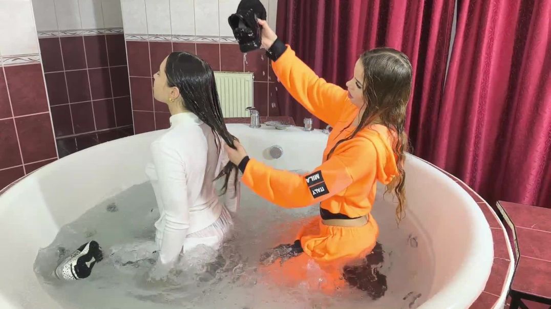 Alessia joins Lisa in the hot tub is a relaxed wetlook scene where Lisa is already sitting in the hot tub when Alessia joins her, both wearing fully clothed outfits that slowly become soaked by the warm water. The video follows their natural interaction as they sit, talk, smile, and pour water over themselves with the handheld shower, focusing on the way the fabric darkens, clings, and moves in the water. There is no rush or staged action, just calm movements, real water, and an easygoing atmosphere that lets the wetlook details unfold naturally throughout the scene.